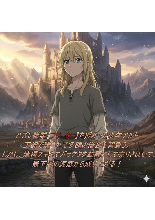 主人公アルトは、病気の母のため王都で一旗揚げるも、授かったのは「フリーター」という最弱の職業。その直後、無一文となり、多額の借金だけが残ってしまう。絶望の底で、アルトは神から与えられたフリーターの力を使い、誰も見向きもしない廃棄物から価値を創り出すという、裏の稼業に活路を見出す。