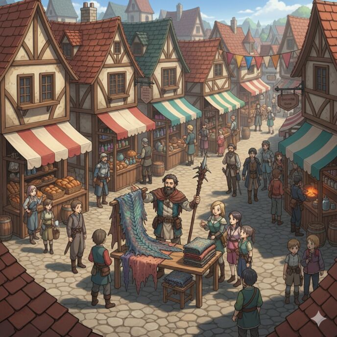 やがて、視界に街が現れた。色とりどりの屋根、尖塔がそびえる幻想的な風景。石畳の道には、魔法の光を放つ屋台や、ドラゴンの革を売る商人が並ぶ。絵本から抜け出した美しさに、アリスは目を奪われた。