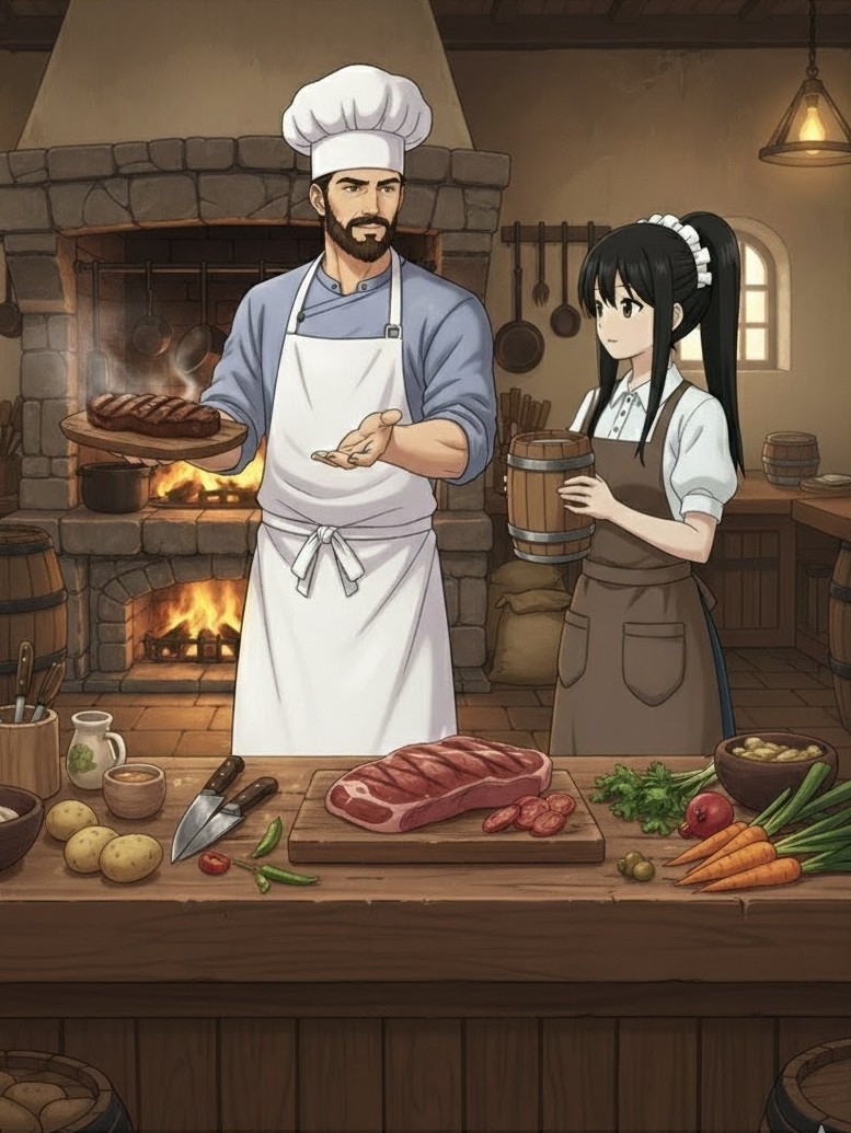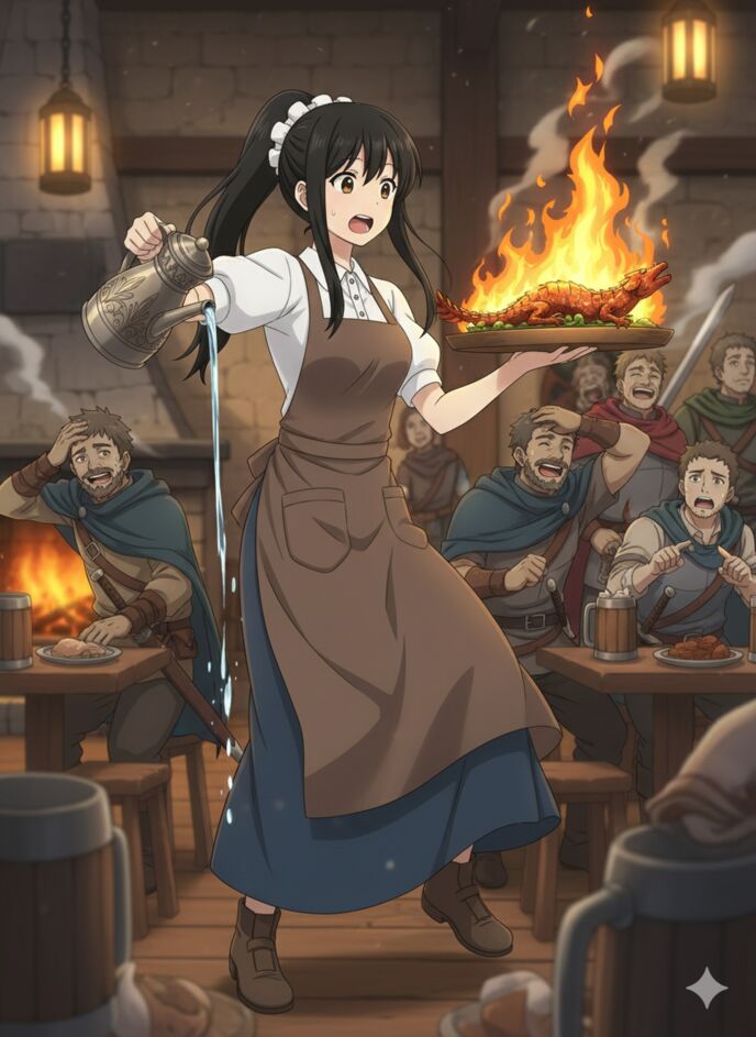初の試練はオーダー取り。冒険者の大男が、ドカンとテーブルを叩いた。「サラマンダーのステーキ、激辛で! ジャイアントボアの串焼きもな!」