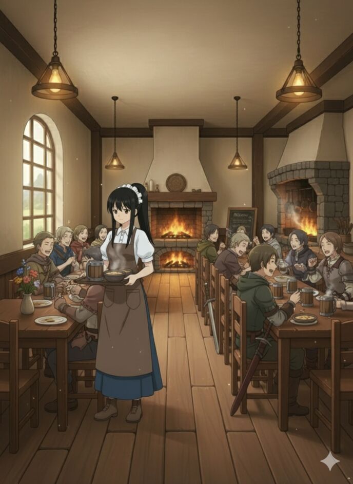 宿泊スペースに戻り、制服に着替える。その日の仕事は、さらに楽しかった。冒険者の笑顔、魔法のスープの香り。ブラック企業の苛立ちとは無縁だ。
