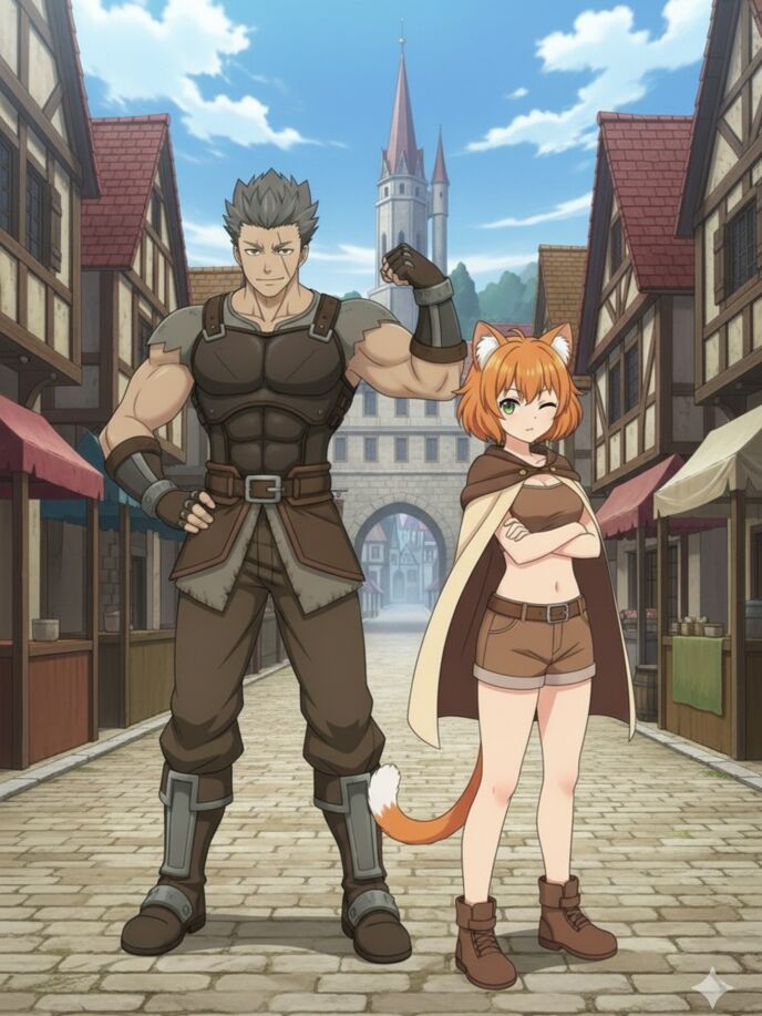 ガルドは咳払いして胸を張った。「ハーフマラソンの訓練で持久力はバッチリだ。剣技も…な、ミャウがそばにいれば、楽勝さ!」ミャウは「ふんっ」と鼻を鳴らし、頬を少し染めて尾を振った。