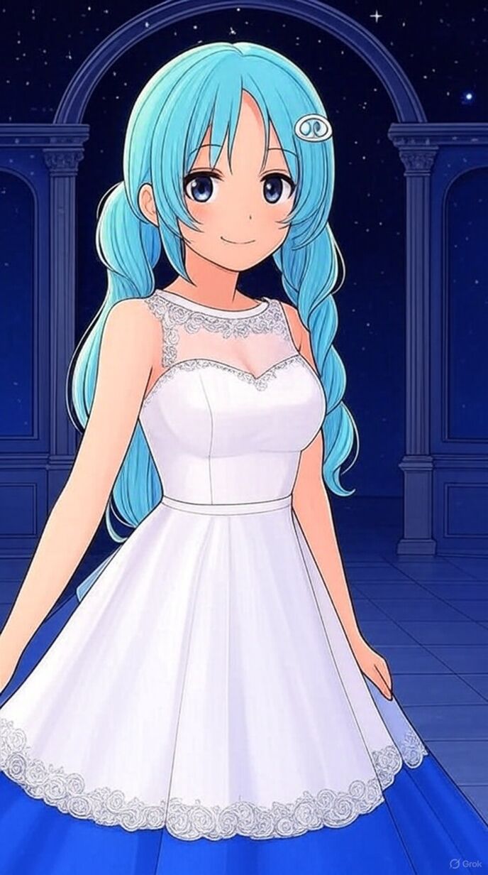 蟹座の使徒アセラは、星の泉のそばで佇んでいた。淡い水色の髪が星光に揺れ、青い瞳には守護の本能が宿っていた。彼女は水瓶座のアクアの妹であり、姉を慕いながらも、守護の使徒として仲間やエテルニアの民を守る役割に誇りを持っていた。泉の水面を見つめ、アセラは呟いた。「この泉が、エテルニアに星の力を届ける…。私が守らなきゃ。」