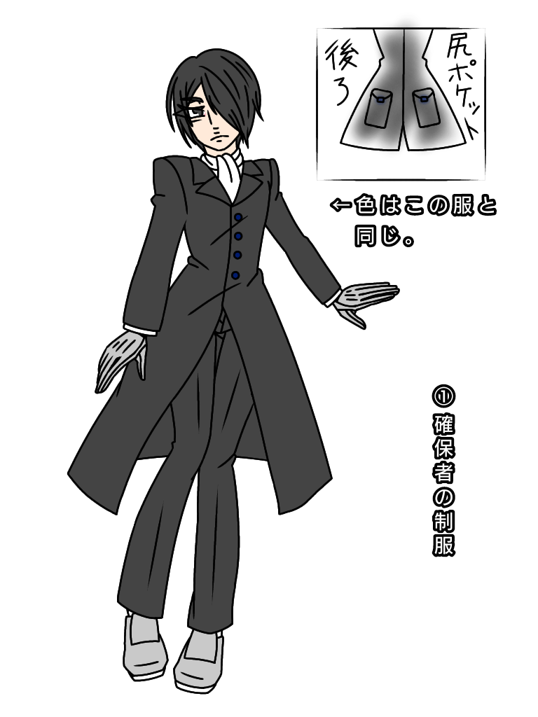 髪型:黒髪、前髪は左目を隠したヘアー。