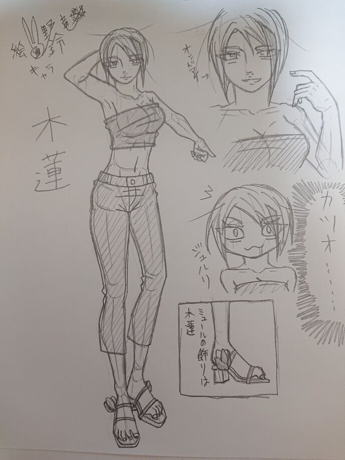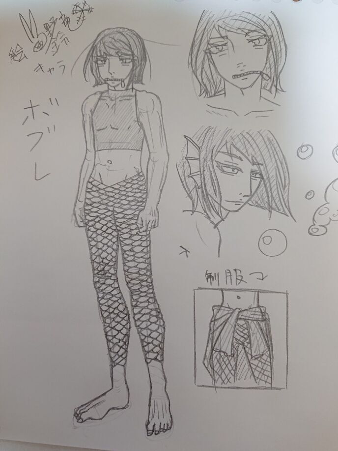 制服:制服① >> シャツではなくノースリーブのインナー、いつでも下半身を魚体化できるようにズボンは自らの妖力で作った鱗製(変化を解くと無くなる)、上着は腰に巻いている。