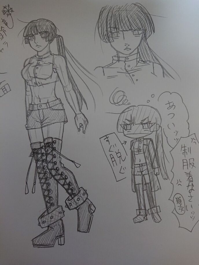 制服:制服① >> 制服の上着は体のラインがわかる程ピッチリとしたロングコートのようなもので、茶色い太腿までのロングブーツ。