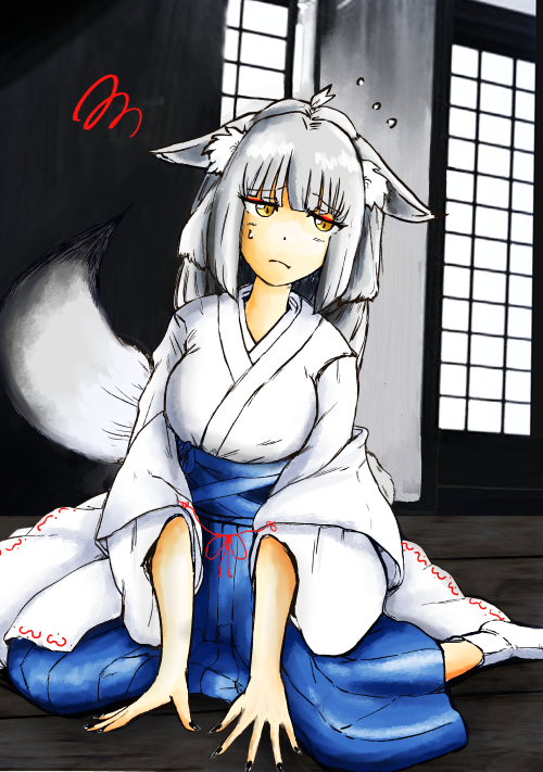 『旦那様』と呼ばれていた彼女は、自身の程よく膨らんだ乳房の辺りを抱えこみ。己の袴と装束、たくわえる尻尾まで汚れるのも気を止めず、涙目でその場にへたへたと座り込んでしまうではないか。