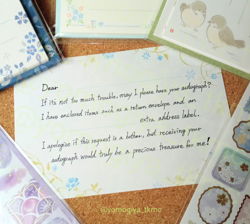 国内のアーティストへのファンレターでは、応援する気持ちを綴った手紙以外のものを同封することはどんな場合(物)でもしてはならないことだとされているが、しかし海外ではファンレターに『サインのお願い』を同封することはマナー違反などではなく、むしろしていいことなのである。