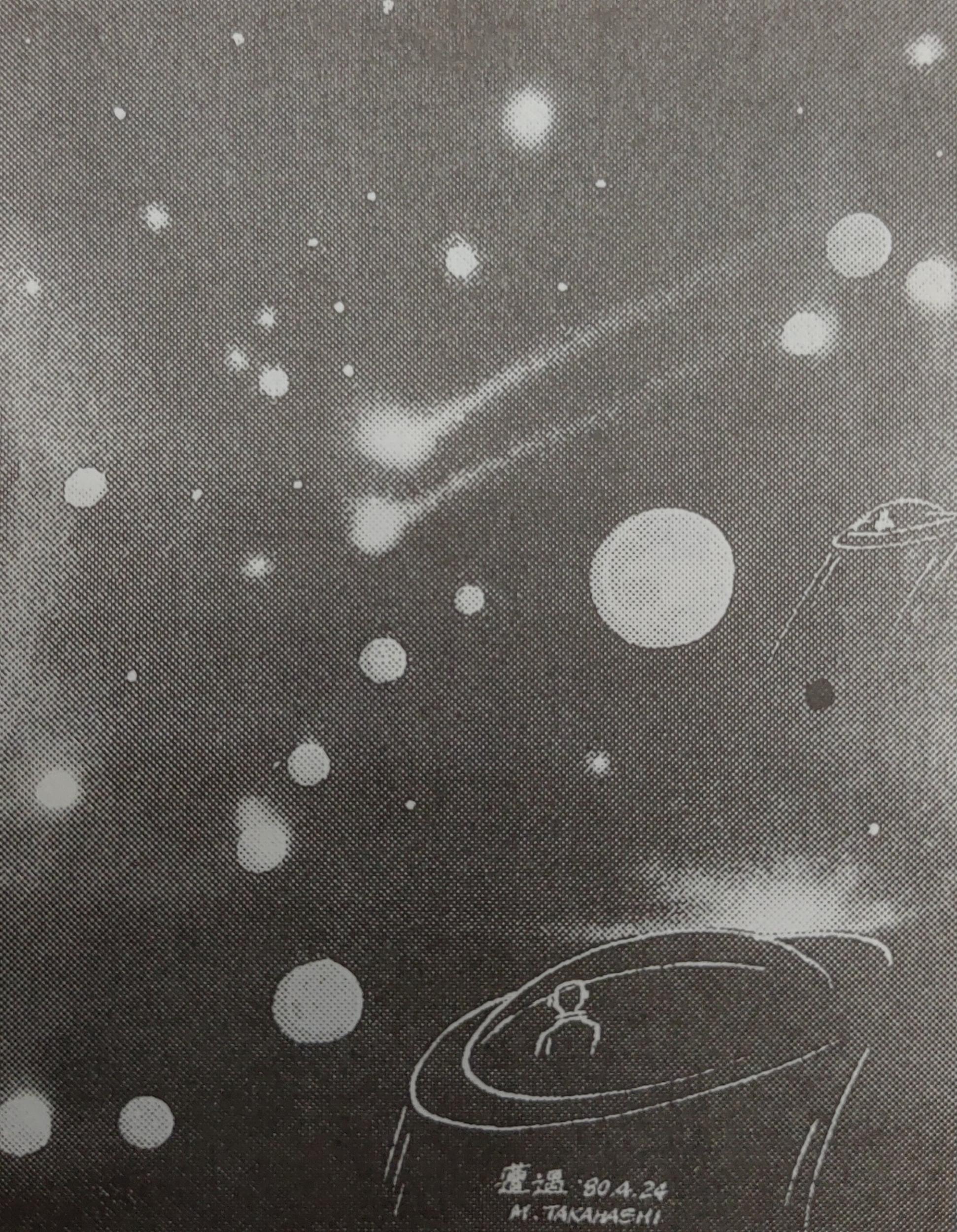 一九八○年四月二十三日午前二時頃、自宅二階北側の窓より北北西の方向から、またもや昨年十月一日に遭遇した、あの緑青、オレンジ色に光る物体が宙に浮いている。と、黄、緑、オレンジの光を強く放ちながらだんだん私の方に向かってきた。