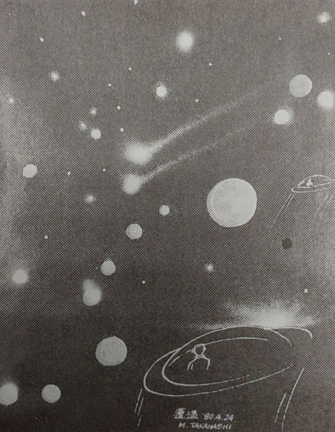 吸い上げられた部屋は何もなく、銀色に光っていて、私は椅子に掛け宇宙の美しさに見とれている。UFOはすごいスピードでどんどん未知の宇宙を進む。何とも快適である、途中いろんな星・星が青く、赤く黄色く輝いてまるで私を祝福しているように感じた。と、突然右上方より二つの流星が左下方に走る。