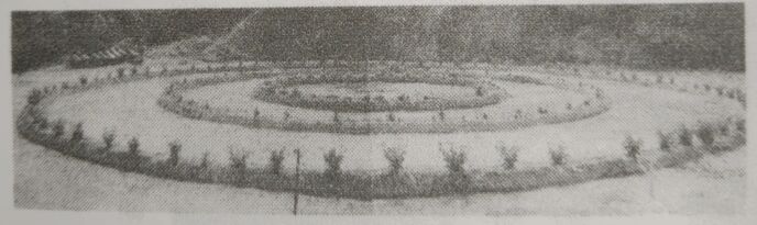一九九二年三月勤務先、(旧)庵治観光ホテルで、当時社長・中村律雄氏の肝入でホテル裏、建設予定の整地に、最大直径二十メートル三重・同心円のUFO花壇完成。