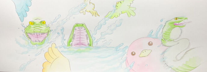 ワニがさけぶと、びっくりしたことりたちはいっせいに羽をひろげ、じめんをとび立ちました。