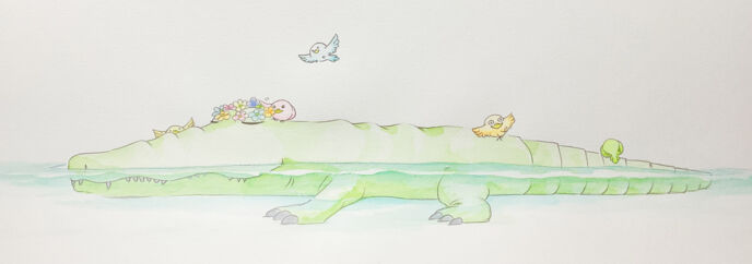 そしてそれまでは少しとおくにいたおくびょうなことりたちまで、ワニのせなかや頭の上であそぶようになったのです。