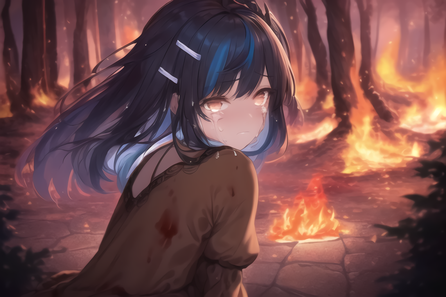 全き闇夜を切り裂く光は草木を焼き尽くす業火。夜明け前の森が燃え盛り、天高くまで黒煙が立ち上る。ごうごうと荒れ狂う火災の気流が逃げ惑う動物たちの悲鳴をかき消す。