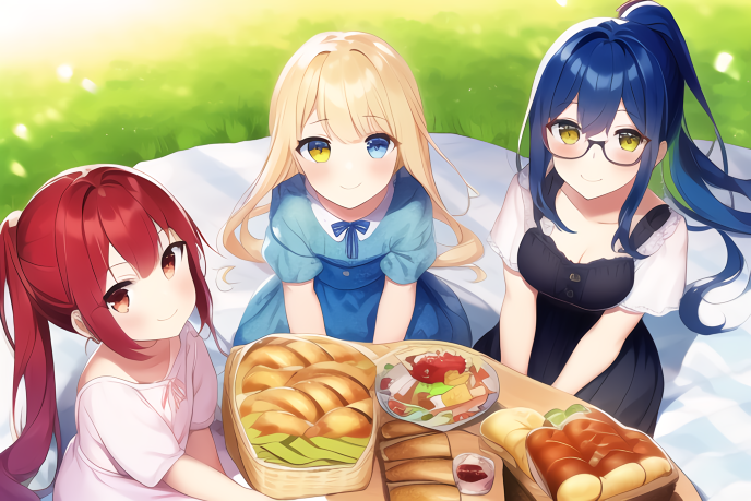活発なレイは寝間着のように緩いシャツを纏い、頭脳派のニースはシックで落ち着いた服装、オッドアイがミステリアスなパリラはリボンが愛らしいワンピース。いつも一緒に服を買いに行く三姉妹らしく、それぞれに小洒落た服装だ。昼食が詰まったバスケットを並べ、すっかりピクニック気分で彼方を見上げて一緒に座るように目で促す。