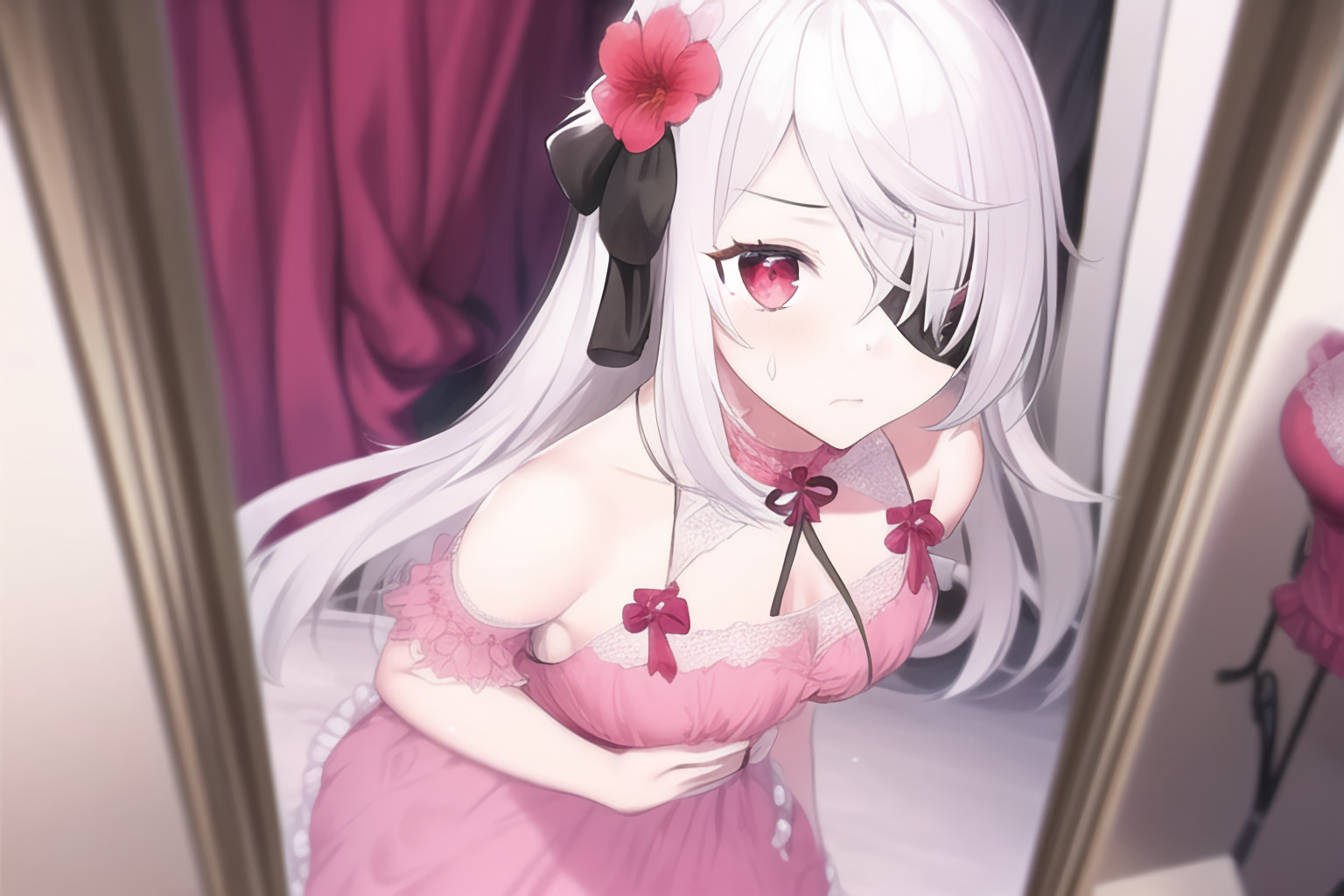 桃色のワンピースを持った此岸が試着室へとぐいぐい強引に押し込んでくる。元々頼んでいる身でそこまで言われると断れず、彼方は仕方なくそれを持って鏡の前に立った。