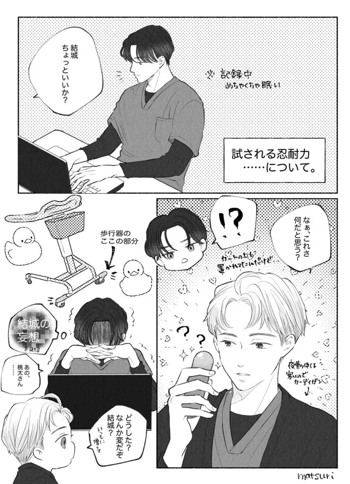 結城李仁が老若男女に非常に人気があるのは周知の事実である。第一に、顔の造作が良い。素の結城は三白眼で無愛想な表情をしているが、何故か笑顔は優し気で、人々の目には麗しい笑顔に映るのだ。加えて学生時代は帰宅部だった割にそこそこ恵まれた体格をしていることも、結城のモテる要素のひとつである。桃太もつい最近知ったことだが、妹である瑠海の一件があってから心霊現象に対抗すべく心身ともに鍛えようと独りで黙々と筋トレをしていたらしい。学生時代の青春をハンドボールに捧げた桃太と比べるとさすがに筋肉量は劣るが、それでもかなり引き締まった体つきである。桃太と結城が働く病棟だけには留まらず、他病棟、他部署、はたまた患者の中にも結城に心酔している人々がいることを桃太は知っていた。時折声を掛けられては丁重に断っている結城の姿を目にするが、事あるごとに「みんな俺の外側しか見ていないんです」と自嘲気味に答えるのがお決まりのパターンだった。結城は多くの人に愛情を差し出されてもなお、自分の容姿に価値はないと思っている。桃太はいまだにそれが不思議だった。
