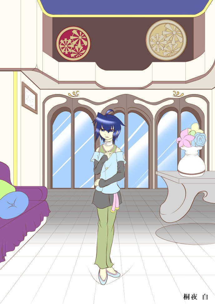 淡い桃色のラインの入ったケルディア社の青磁色の服の上に、シントン社の群青色の服を着せ、