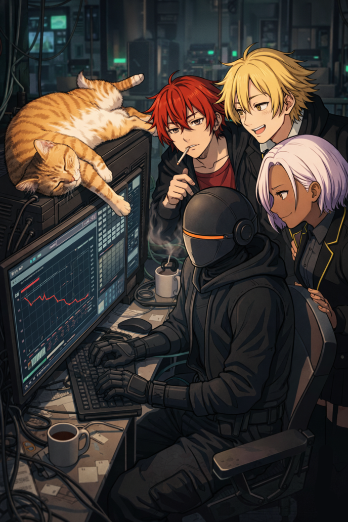 タワーの熱で眠る猫たち、データの渦を見つめるAI。