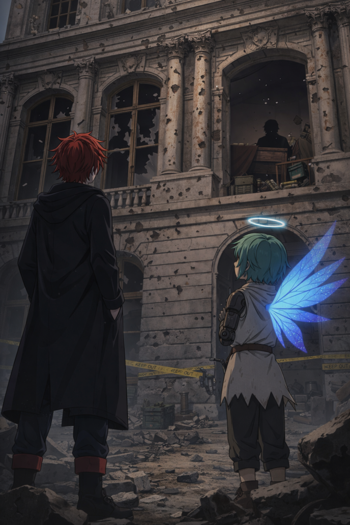 青く透きとおる羽をふるふる揺らしながら、彼女は瓦礫の谷間に目を凝らす。