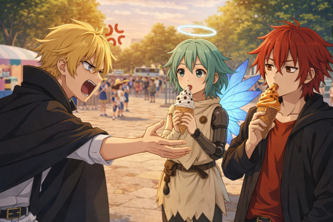 「天使と悪魔って言ってもよ、ソフトクリーム優先のときは人間以下なんだな!」