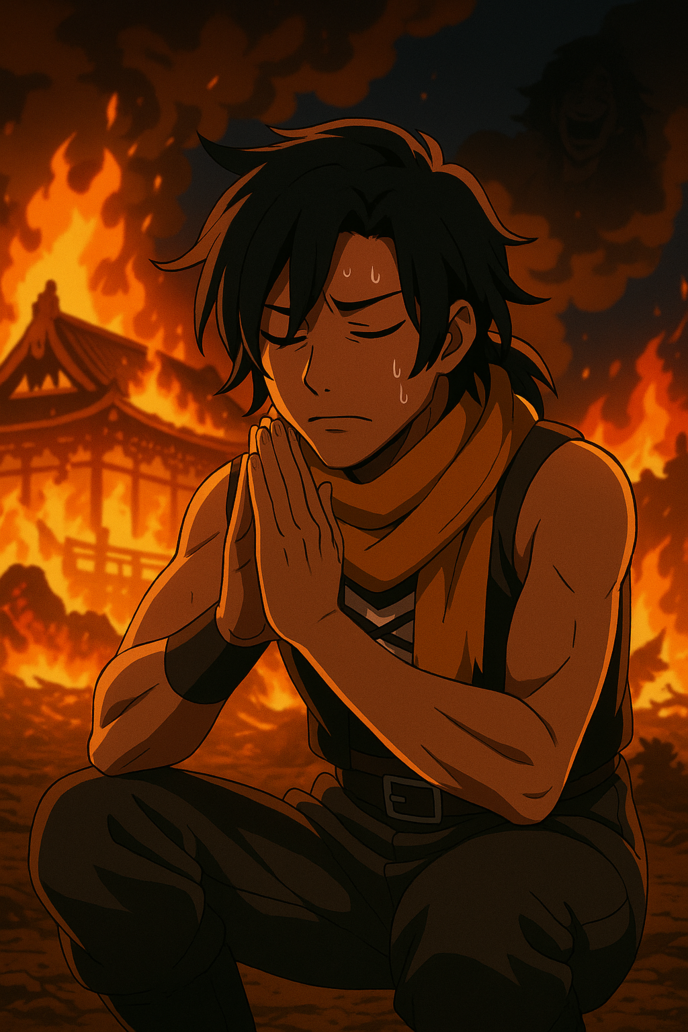 火の粉が舞い、五重塔の残骸が真っ赤に焼ける夜。