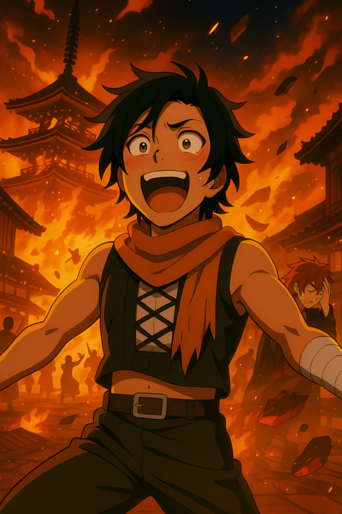 サタヌスは火の粉舞う京のど真ん中、両腕組みでうっとり夜空を見上げていた。