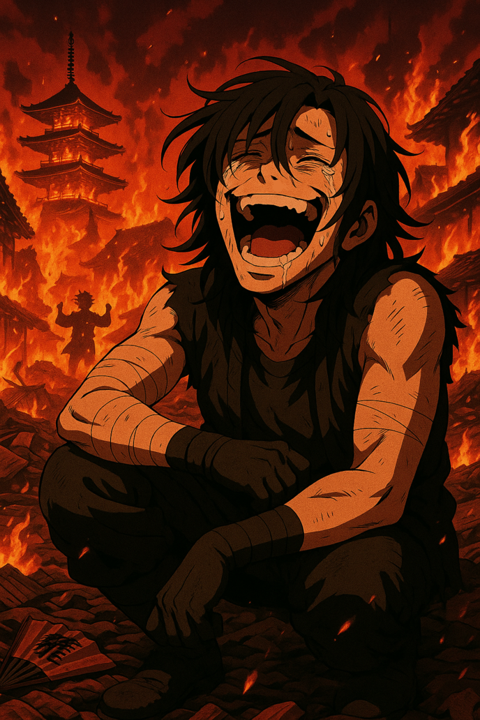 サタヌスは燃え盛る寺の前で、超満面の笑顔。