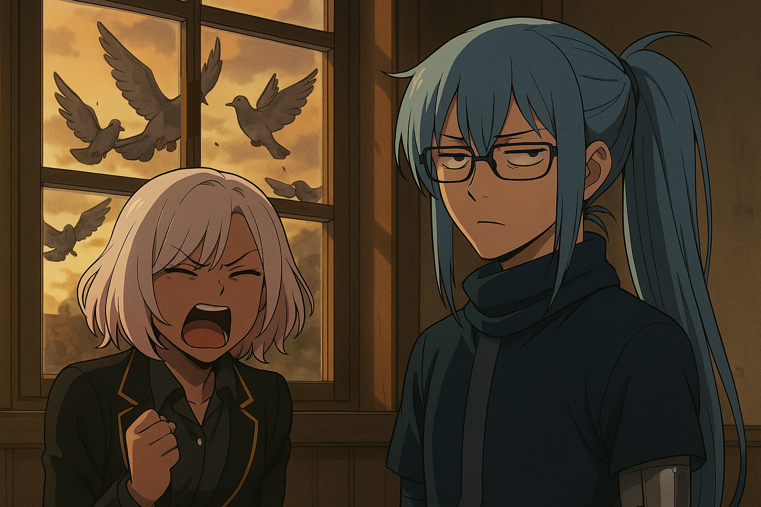 窓の外で鳩が一斉に飛び立ち、建物の周囲をパニック状態で旋回する。
