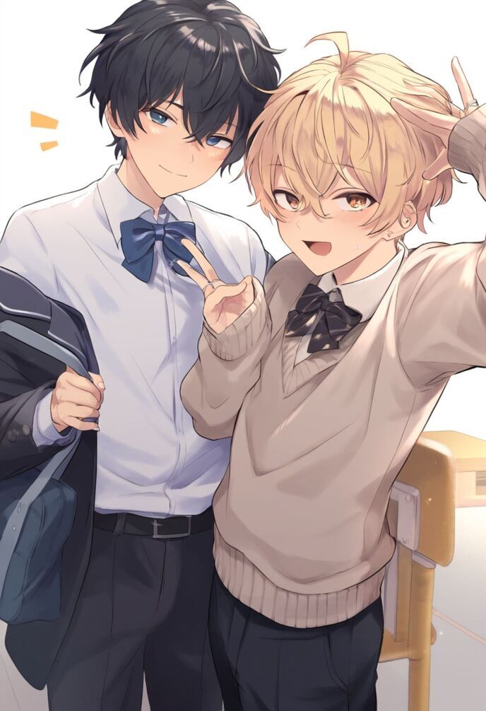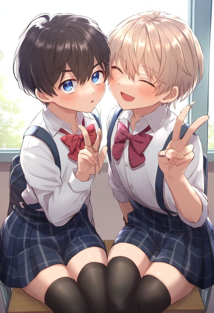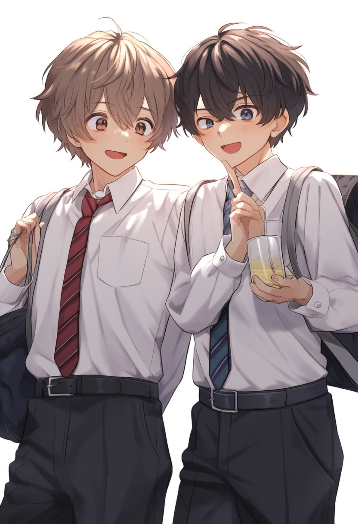ハ「ネクタイ含め、制服がだいぶ正確だそ!左の子が飲んでる、謎の黄色い液体の正体とは…?」