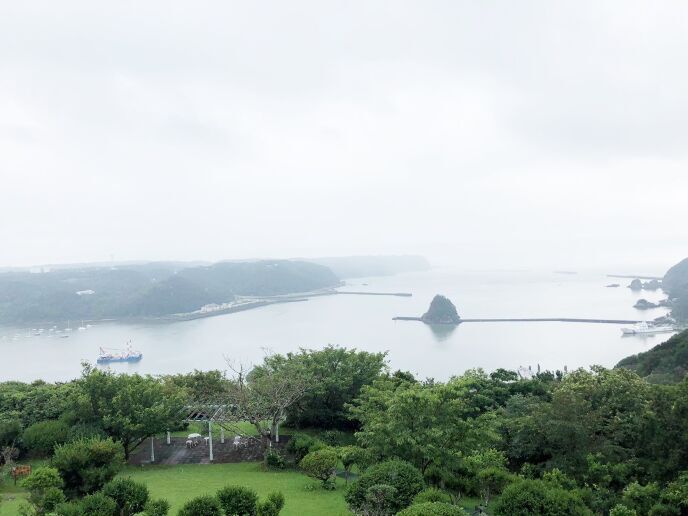 寝姿山山頂駅でロープウェイを降りて、遊歩道を歩く。しばらく行くと展望台があり、港の景色を二人で眺めた。