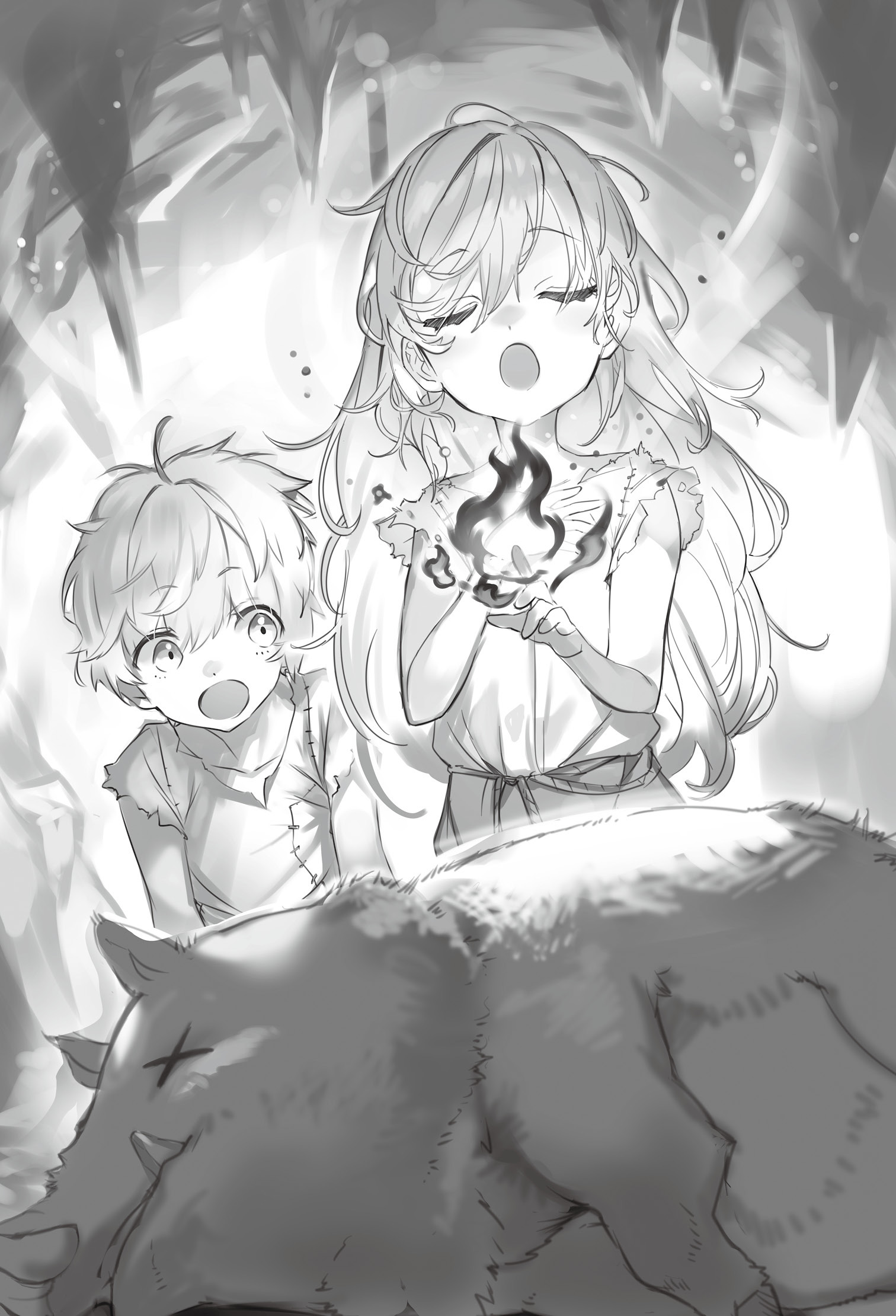 見慣れない人影に魔物が首をもたげ、鼻をひくつかせる。しかし、茂みの隙間から覗く魔物の視線にも、背後から聞こえる唸り声にも反応せず、二人の幼子は虚ろな目を地面に向けたままだった。
