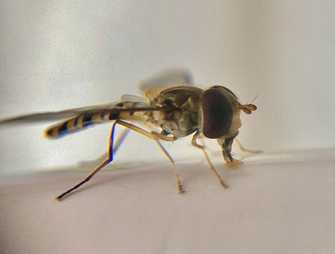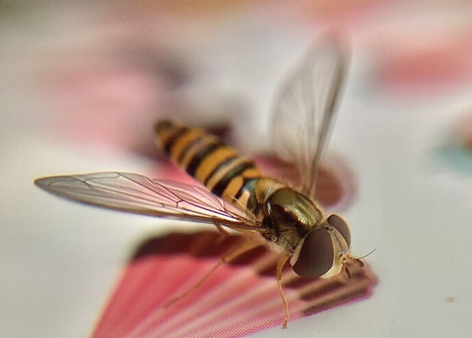 お腹の縞模様がハチに似ていますが、ハエの仲間なので人を刺しません。