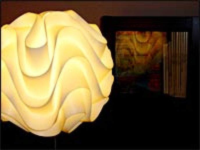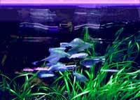 マンションの一室。暗めの室内にミッド・センチュリー風の背の高いスタンドの明かりと、小さな熱帯魚が何匹も泳ぐ水槽の青い電灯が点いている。