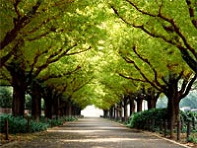 木々の葉の間から信号機が見え、黄色から赤に変わる。