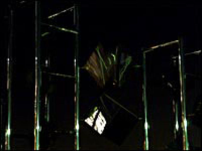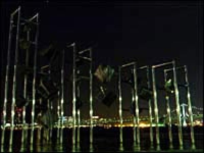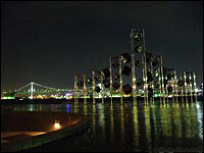 無数のステンレス・キューブがポールに取り付けられているオブジェの脇から美しい湾岸の夜景が広がって見える。