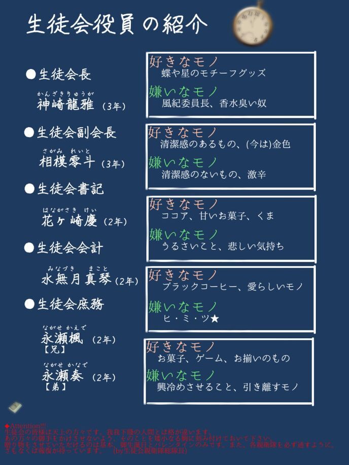贈り物をさせていただけるのは基本、御生誕日とバレンタインのみです。また、各親衛隊を必ず通すように。