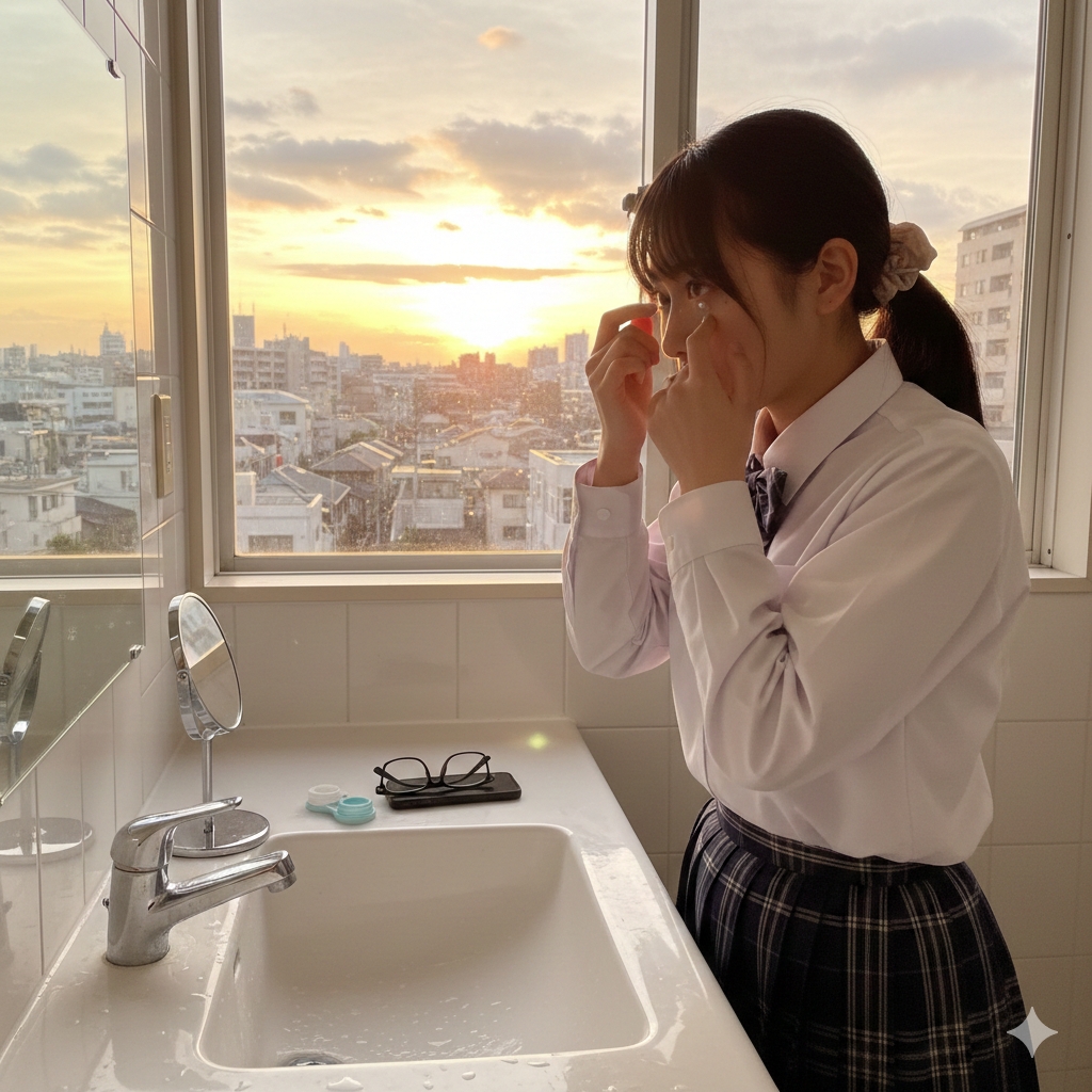 度数は、-5.00Dだ。私はすぐにでも着けてみたくなり、洗面所を借りて着けてみることにした。コンタクトケースに保存液を用意していると、洗面台の棚に度の強いメガネが置いてある事に気付く。五月女さんのお宅のデジャブなのだが、どうやら佳奈のお母さんのメガネに違いない。寝る前ににかけると言う分厚い眼鏡だ。私は、その誘惑に勝てない。自分の装着しているコンタクトを外しケースに収めると、そのメガネを手に取り目の近くで、観察する。