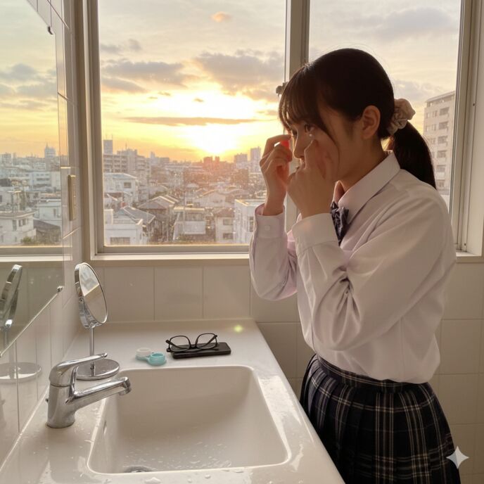 自分のコンタクトに戻す為に、洗面所を借りた。カラコンを外し、もう一度、佳奈のお母さんのメガネを借りてかける。改めて思う。なんてクリアな視界なのだろう。ただ、世界が、湾曲している。私は、この視界に興奮を覚えた。外すのは惜しいが、今はとにかく視界をもとに戻す為に自分のコンタクトを装着する。眼鏡も元の位置に戻す。