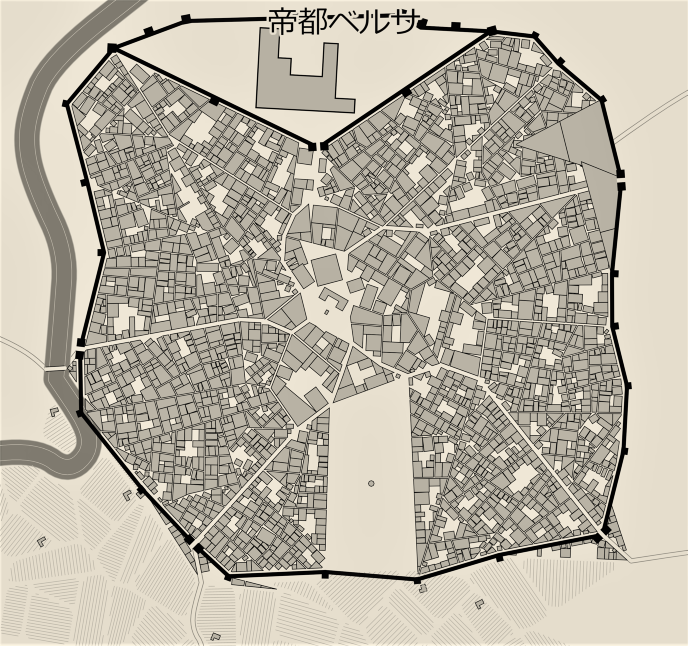 街を囲んでいる城壁は建物の一階部分より少し上までを隠す程度でそこまで高さはないようだが、城の方はかなりの高さがある城壁で囲んでいるようだが、恐らく侵入者を防止するために城壁の周囲には堀を巡らして出入り口には吊り橋を用意してあるのだろうと推察できる。