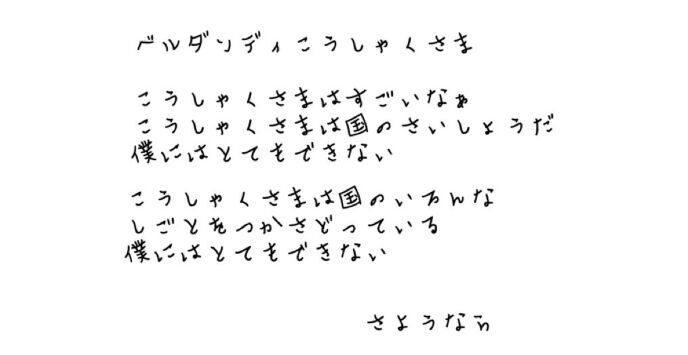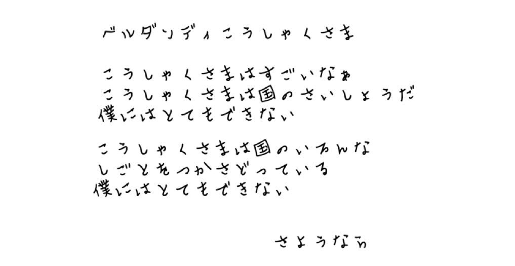 そう確信して、僕は例の手紙をふたりのいる扉についている郵便受けっぽい小窓から投げた。それを恭しく拾いベルダンディ公爵はそれはそれは壊れ物でも扱うように、大切そうに胸ポケットへしまい込んだ。