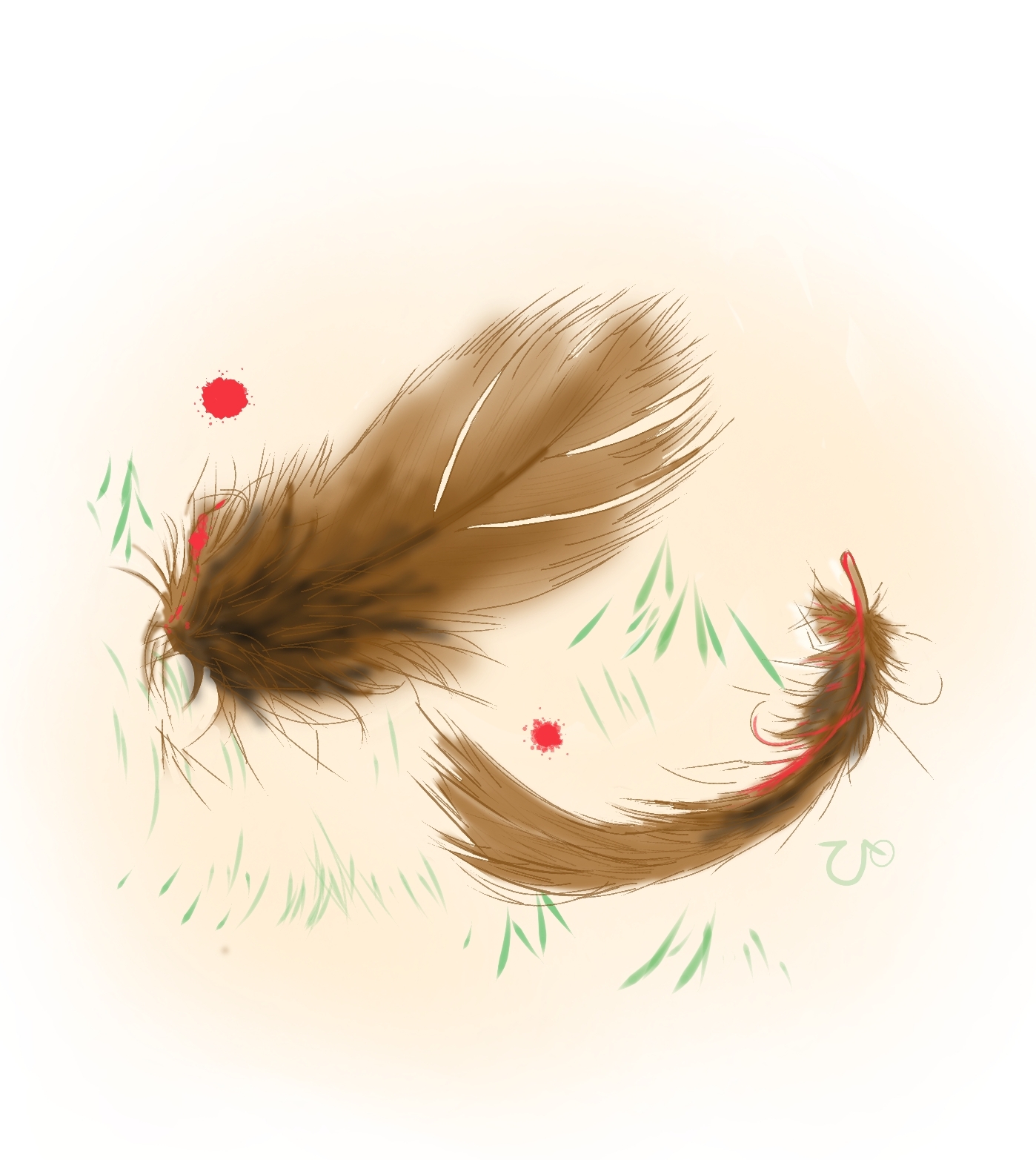 ⑤ 巨鳥の怪音波にもめげず、なんとか倒した後、3人は羽根を毟り始め、解体して、良く見えなかったけど多分貴重だとか使い勝手良いところなんだろう部分を荷物に収め、大半のお肉や骨等を穴掘って埋めてた。