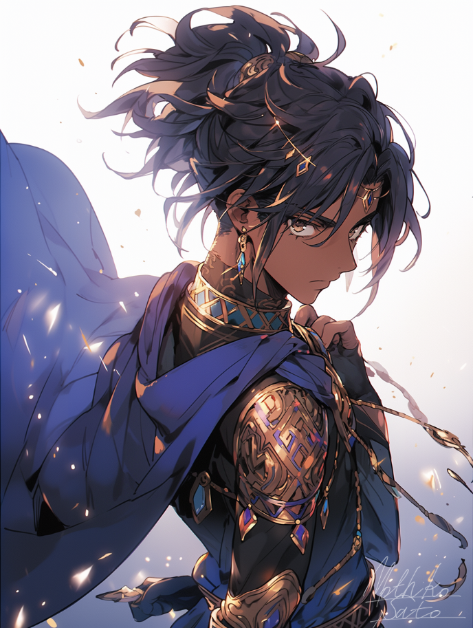 服装: 彼はグランサリアの伝統的なローブを身に纏っており、そのデザインや色彩は彼の家系や地位を象徴しています。ローブは深い紫色と金色のアクセントで飾られており、その中には星や宇宙のモチーフが織り込まれています。