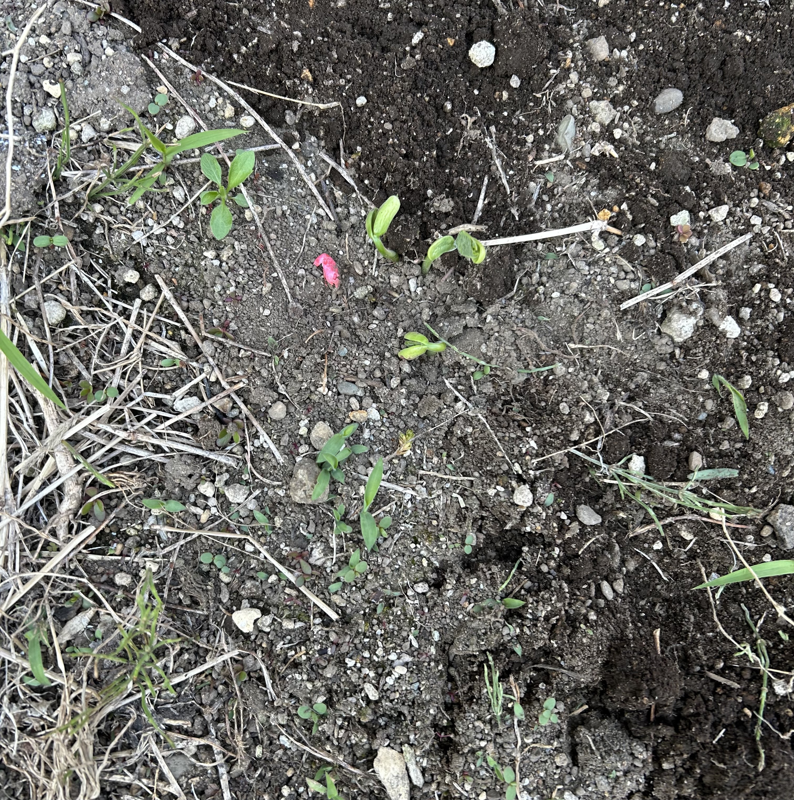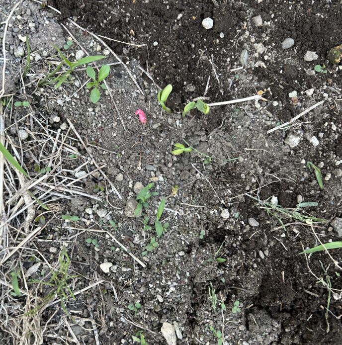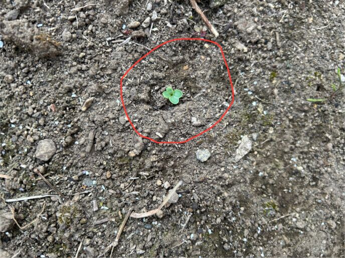 実はここ、枝豆を植えていた畝の片隅なんです。枝豆はさっき植えたばかり。なので、この芽が枝豆ではないのは明らか。何の芽か特定できず、少しワクワクしています。これからどんな成長を見せてくれるのか、しばらく様子を見ていきたいと思います。