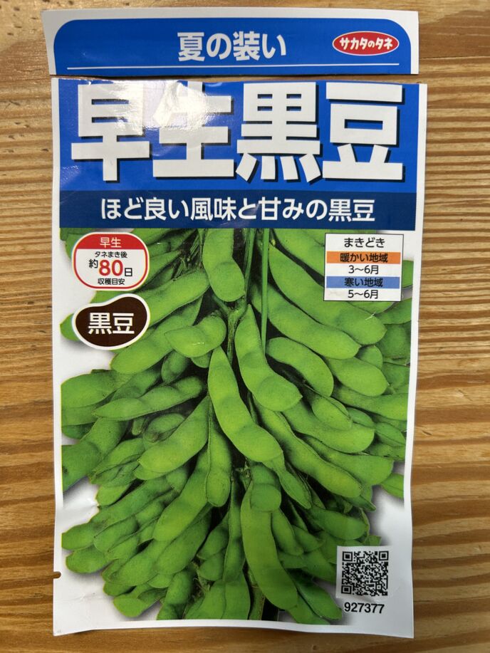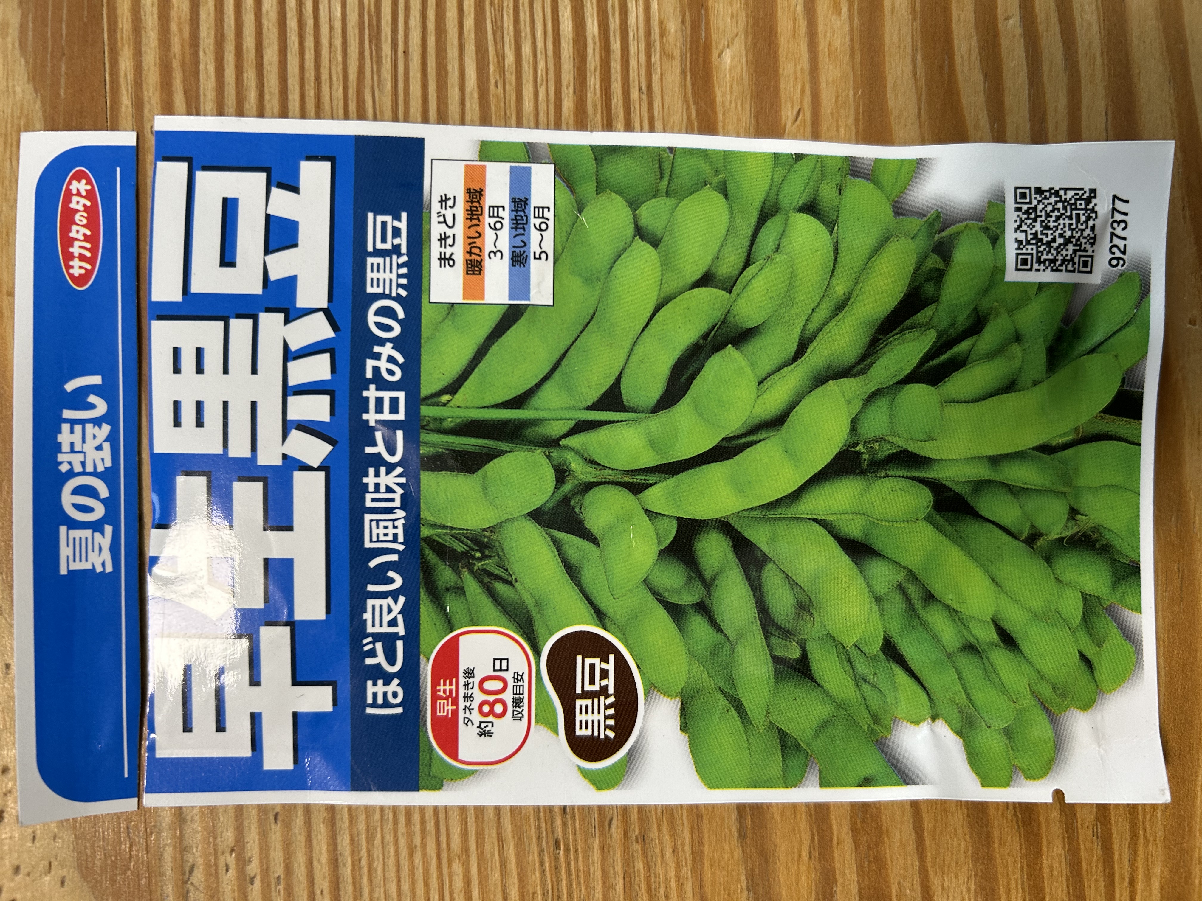 そして、今回は枝豆の種を追加でまきました。黒枝豆ですね。夏の装いなんて、おしゃれな名前。昨年も別な黒枝豆を育ててとってもおいしかったので、今年もまいちゃいました。早生なので以前の晩生タイプより後まきです。ちなみにすでにどこにまいたか忘れているので、芽が出るまでのお楽しみです(笑)