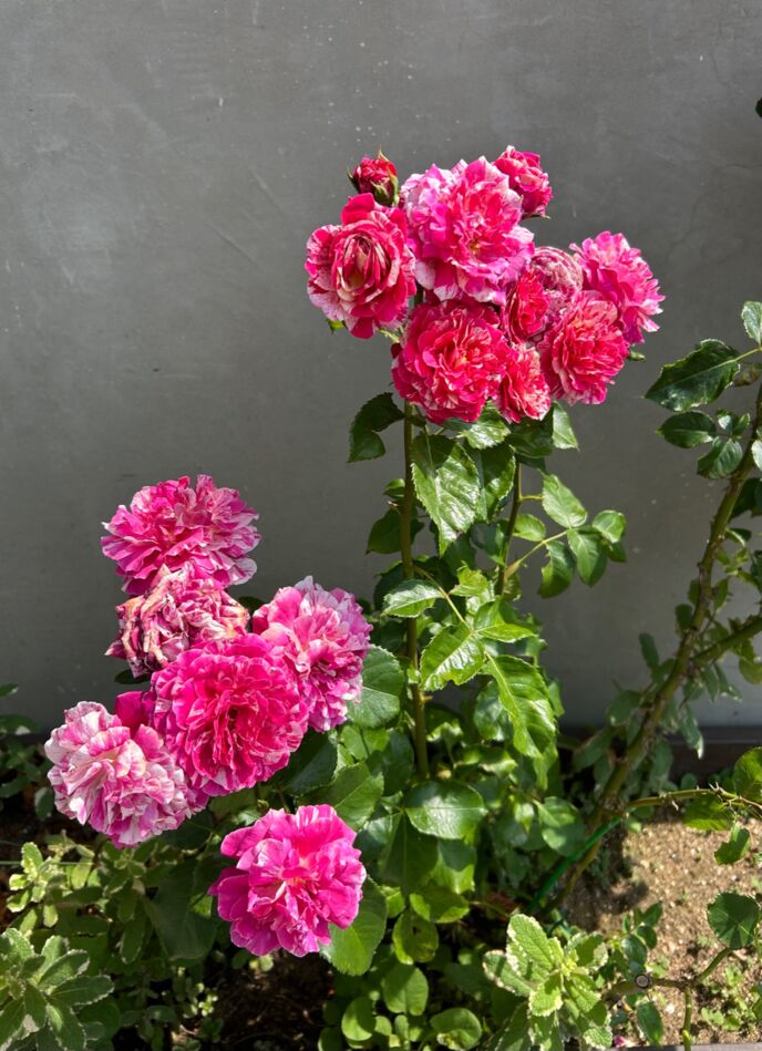 このトイトイトイ!は、鮮やかな濃いピンクに白っぽい絞り模様が入った、とても個性的で華やかなお花です。見た目のかわいらしさに加えて、花付きが良く、枝もよく伸びるのでコンテナを一気に華やかにしてくれます。私にとっては1株で主役級のバラ。