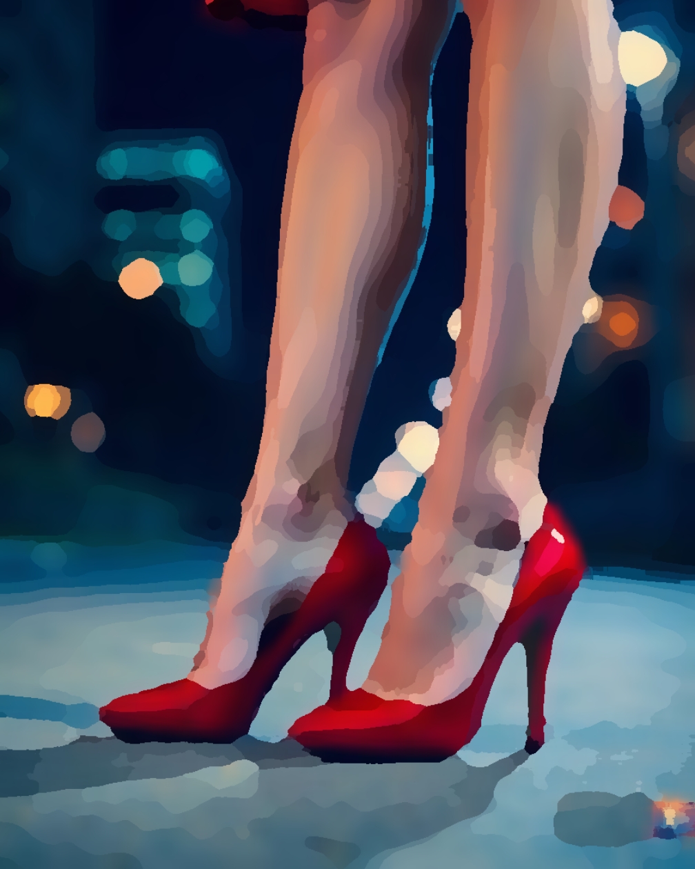 玄関ドアを開けて中に入る、うつむきながらドアをしめるとき、隙間からハイヒールを履いた女性の足と赤いワンピースが見える。