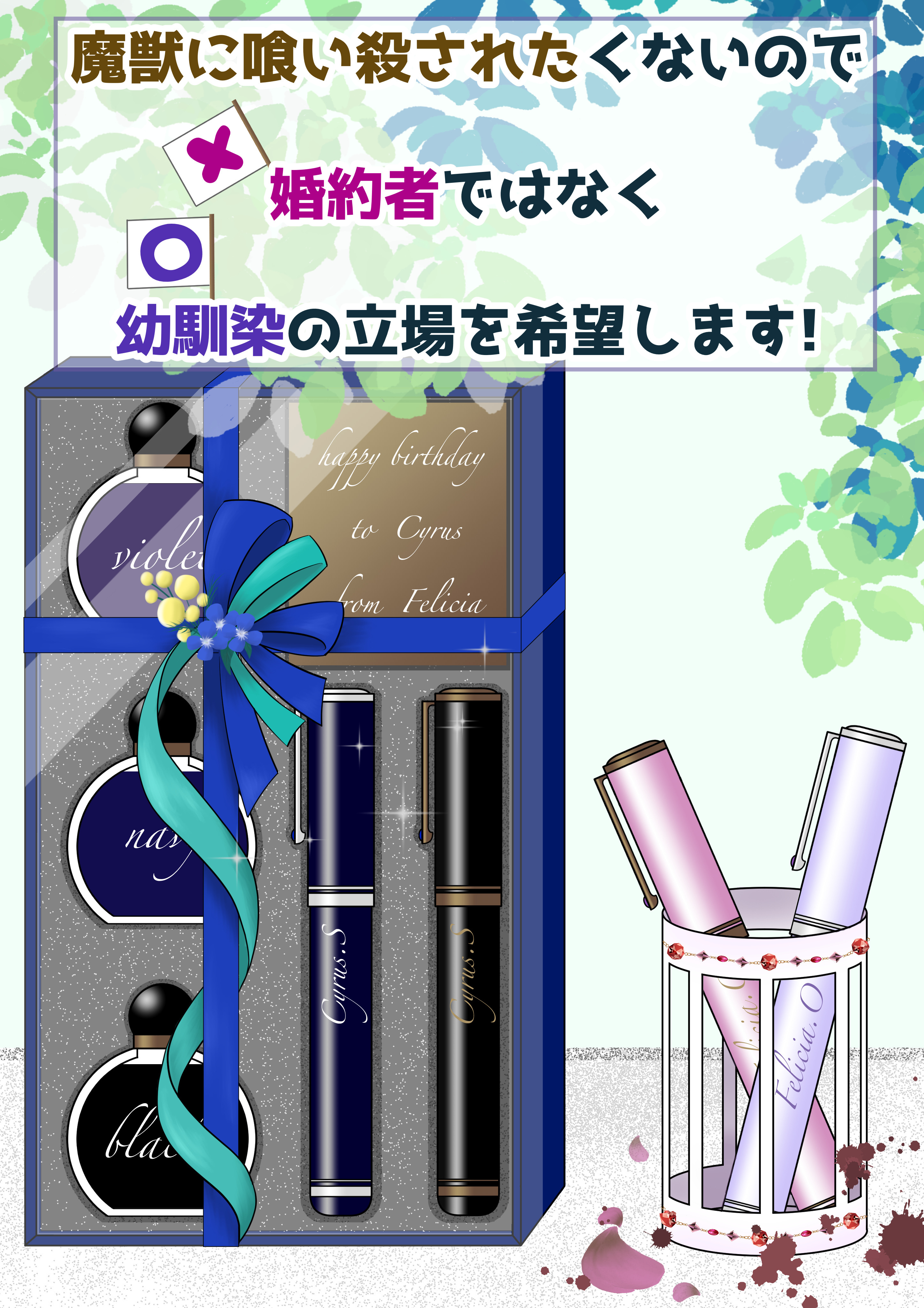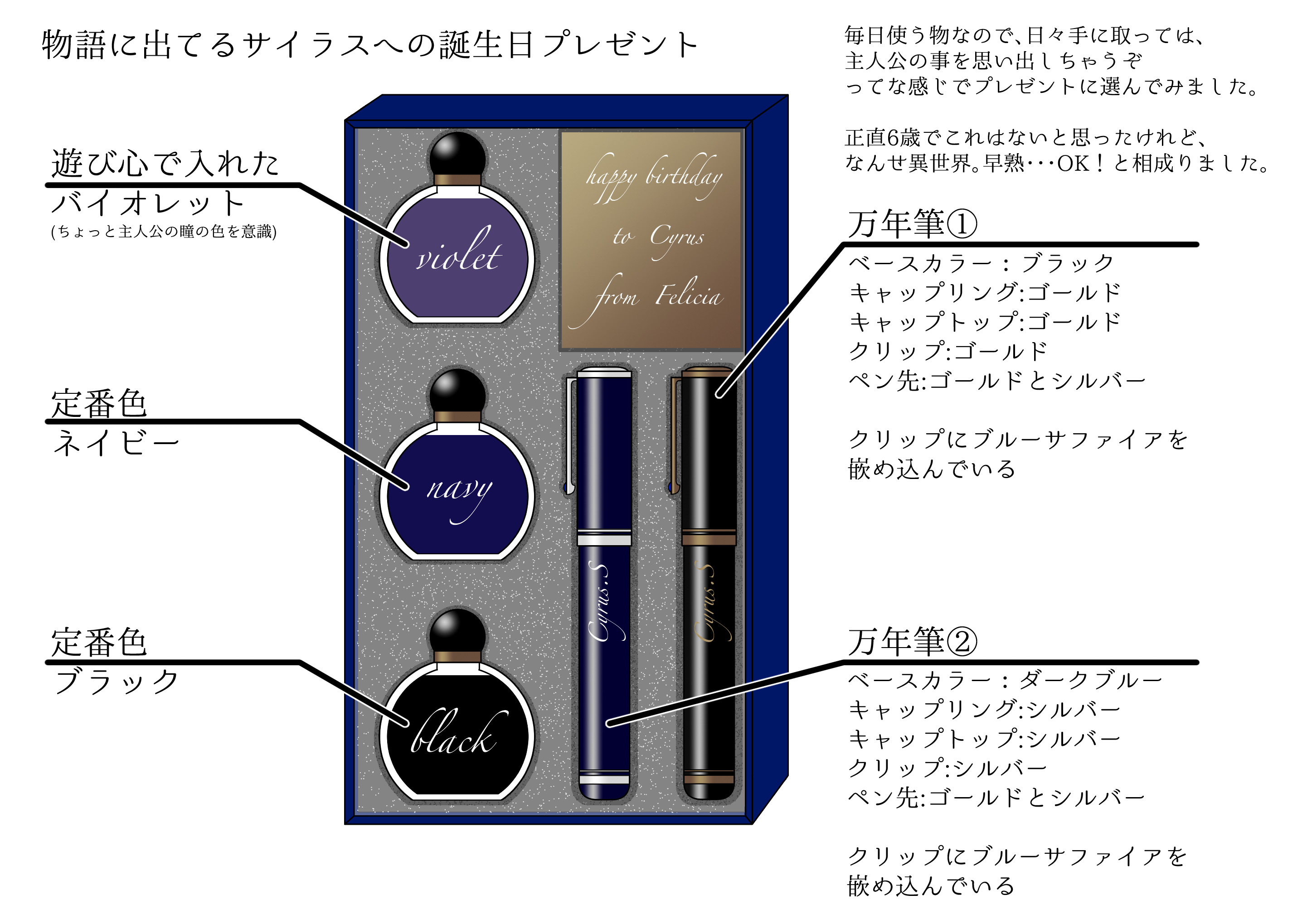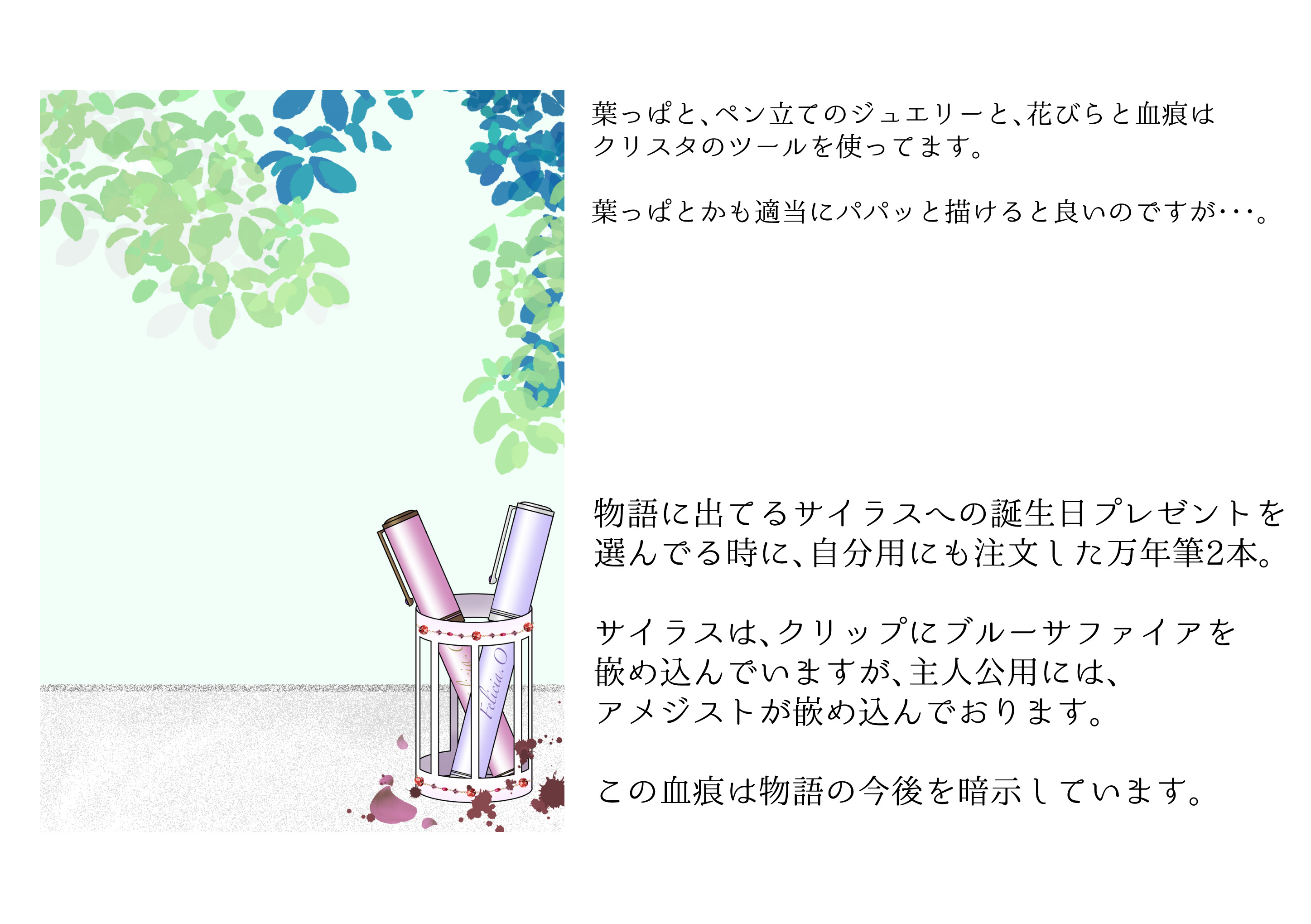 万年筆もうちょっと頑張って、おしゃれな感じにしたかったですが、あまり絵に時間を割きすぎると小説が書けない!状況に陥ってしまうので、程々にしましたっ。まぁ、画力の問題もあるのですが💦