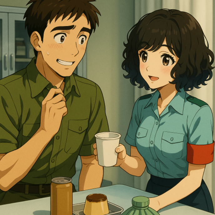 島田は整備班長だけが許された特権であるプリンを指でつつき、目を細める。艶のある表面をスプーンが滑り、柔らかく沈む。彼の表情は、普段の粗暴さを忘れさせるほど穏やかだ。プリン一つで満足する男の幸福が、そばで見ていて滑稽でもあり、温かくもある。