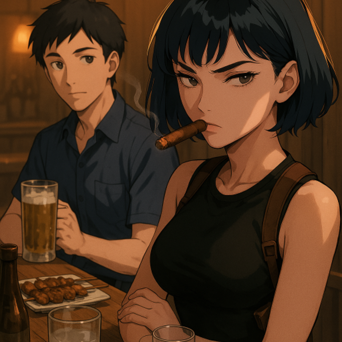 かなめはそう言いながら再び葉巻をくわえた。火を点けるライターのチッという乾いた音。吐き出された煙が、カウンター上で薄く層をなし、提灯の赤に溶ける。