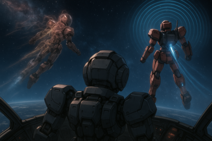 誠はランとかなめの会話から自分が『予備』ではないことを、準備の手順ではなく空気の重さで知る。ランの確信と、彼女がしきりに口にする『素質』という語。補給係の仮面の下に、別の役割が用意されているのだと、ようやく骨で感じ始めた。誠は、先ほどかなめが言った通り、背中のバックパックに満載された……かなめ機専用230mmロングレンジレールガンのマガジンコンテナ……を、いつどのタイミングでパージするかを考え始めていた。